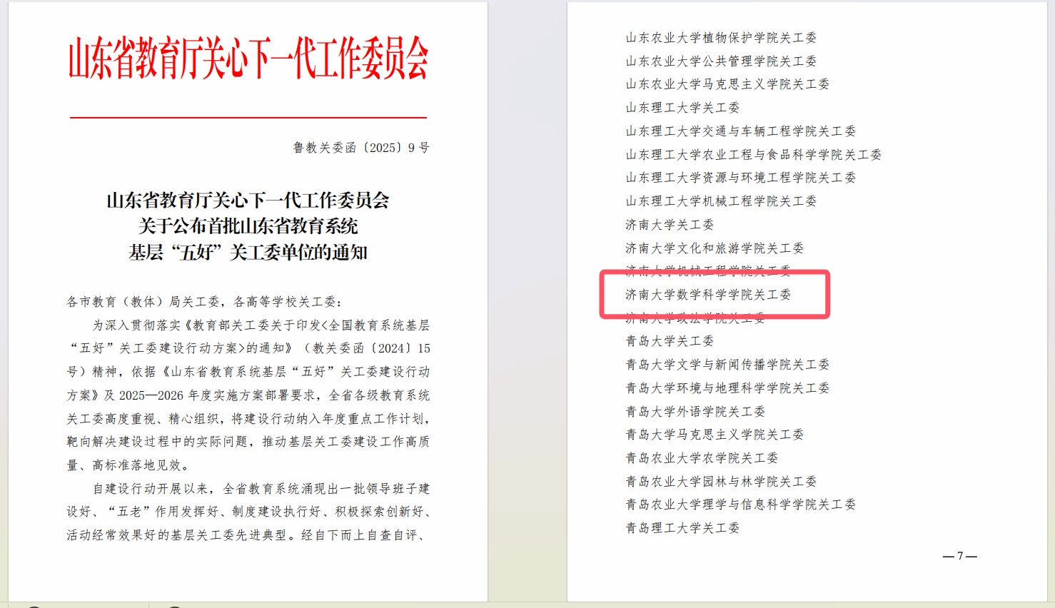 近日,山东省教育厅关心下一代工作委员会公布首批山东省教育系统基层“五好”关工委单位名单,济南大学数学科学学院关心下一代工作委员会成功入选,成为全省获此殊荣的基层单位之一。