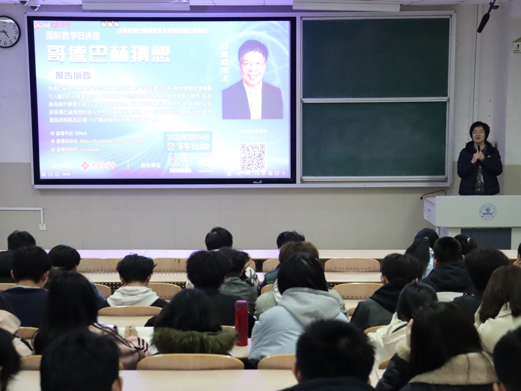 为迎接第七个国际数学日,营造浓厚数学文化氛围,济南大学数学科学学院于3月14日组织大一学子集中观看由中国科学院院士、山东大学讲席教授刘建亚主讲的《哥德巴赫猜想》专题讲座,学院党委副书记、副院长张沂红,团委书记姬磊及2025级辅导员崔瑜出席活动。