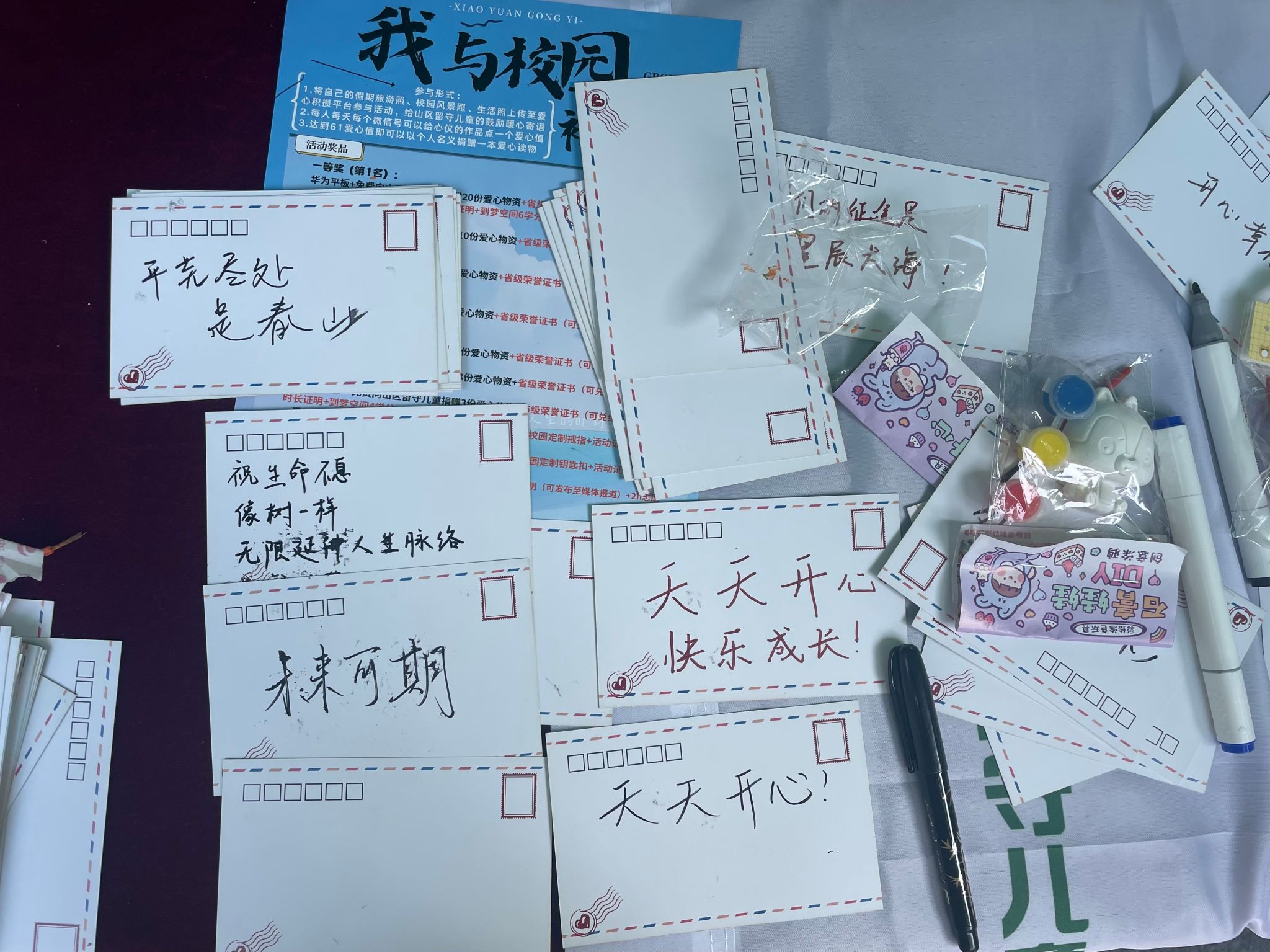 活动现场,精心设计的“戎装印记”特色KT板前人头攒动。同学们手持笔具,将对留守儿童的期许与祝福认真写在明信片上,一张张承载着牵挂的卡片层层叠叠,拼凑成一面充满温度的“心愿墙”。有人写下“愿你眼里有光,心中有梦”,有人画下卡通笑脸并附言“要像向日葵一样,永远朝着阳光生长”,字里行间满是青春的赤诚。