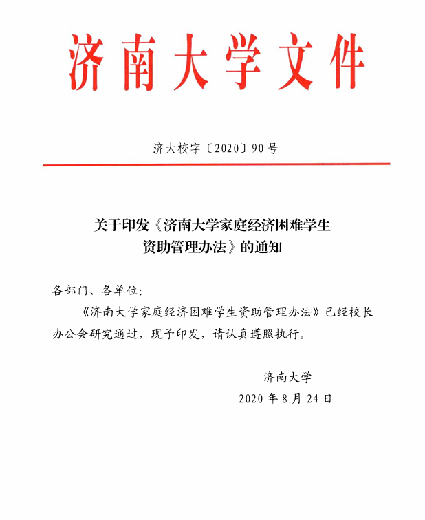 济大校字〔2020〕90号-关于印发《济南大学家庭经济困难学生资助管理办法》的通知